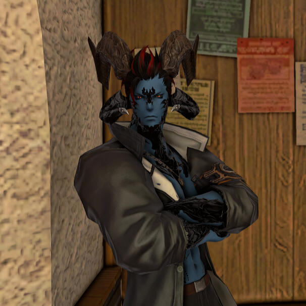 Classes: Gunbreaker/DragoonPhysical DescriptionStanding at 7’1, Xephanos sticks out a bit, even from Xaela standards. While he has horns similar to most of his kin, he also has a pair of black horns protruding from his skull. His black and red hair is tied into a ponytail, though that doesn’t stop his bangs from falling into his face every so often. The limbal ring that most of his fellow Au'Ra have is evident in his eyes, his holding a vibrant orange coloring to them. The common attire that he can be found in is a long red jacket, black pants, and matching black gloves and combat boots. His attire, as well as the look within his eyes makes it clear that not only has he been in his fair share of battles over the years, but that it’s not wise to go out of your way to anger him.Personality TraitsXephanos can come off as a cold and uncaring individual when initially approached, though he has his kinder moments. He’s dangerously confident in his fighting abilities, and he is always content to spar if challenged, finding the possibility of a fight rather enjoyable. Regardless of whether he’s fighting against an ally for training purposes, or on the field of battle for his life, he will not restrain himself. Depending on the situation, he has been told he gives off a presence of authority. Trust is not something that comes easily to Xeph, his belief that it should be earned, not demanded, however, once that trust has been established, he will not hesitate to defend those he has come to call friends or allies.History